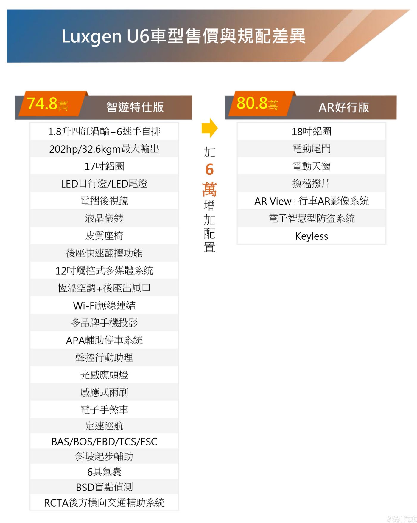 原廠將去年推出的「智遊特仕版」列為常態販售車型,而原先的AR環景版,於此次編成調整中,更名為AR好行版,其他車型則取消,如今U6車系為2車型編成:智遊特仕版、AR好行版,售價分別為74.8、80.8萬元,重點規配如附表。