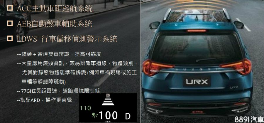 URX為品牌首款搭載ACC主動調距定速(作動時速範圍為30~150km/h)的Luxgen,另與AEB自動煞車輔助、LDWS車道偏移警示,為二階的ADAS智價款以上車型標配,AR環景款以上再追加盲點偵測、MOD物體偵測、AR影像系統、開門防撞等。