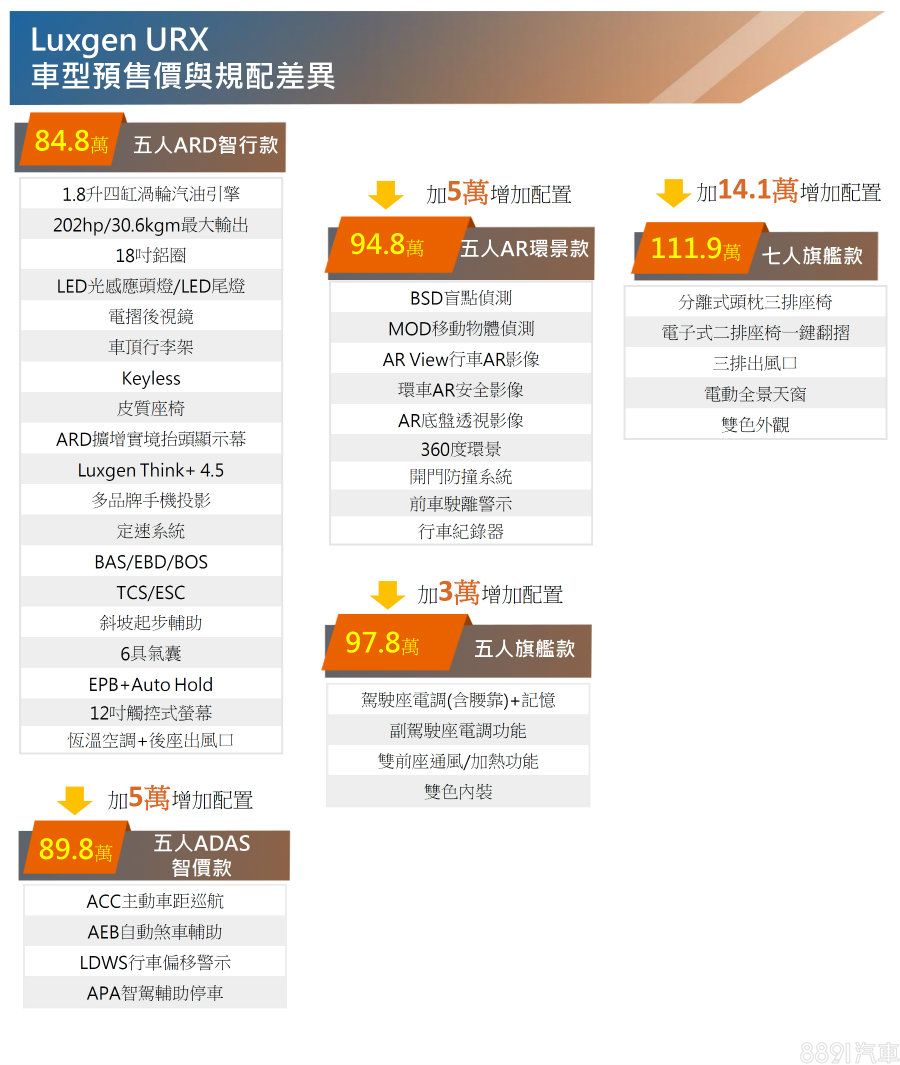 URX車系採5車型編成:ARD智行款、ADAS智駕款、AR環景款、旗艦款以及七人旗艦款,售價分別為84.8、89.8、94.8、97.8和111.9萬元。其中,較入門的智行款及智駕款均較預售價調降1萬,其餘車型售價持平,而除了七人旗艦款為客車認證外,其餘均為客貨車認證,重點規配如下表。