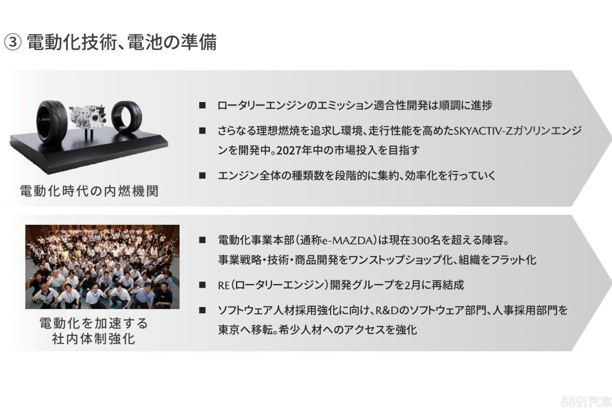 電動化過渡期間,內燃機引擎仍會扮演主要角色,為了對應未來歐盟7期以及美國EPA第4階段車輛排放法規要求,Mazda目前已經著手開發新一代「Skyactiv-Z」四缸引擎,將會取代「Skyactiv-G」及「Skyactiv-X」等現售款,官方宣稱這具全新動力,自低轉到高轉都能執行超稀薄燃燒,實現更高的熱效率及優異能耗,並計畫2027年量產販售。此外,已於2023年11月成立的「e-Mazda」電動化事業部門,目前已有300名員工,將全力推動EV技術及商品開發。