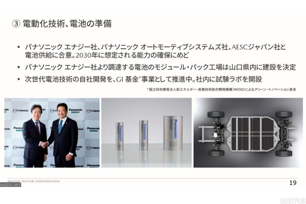 為了全品牌電動化作準備,Mazda將與電池大廠Panasonic合作,確保供應至2030年品牌電動車產品所需,也預計在日本山口縣設立電池工廠,自主生產次世代電池。