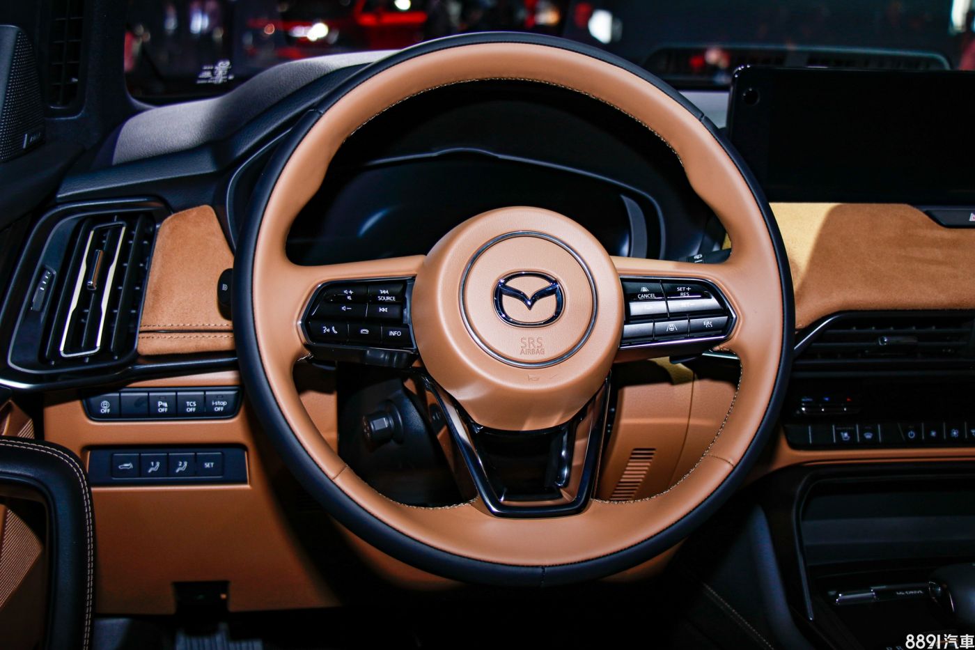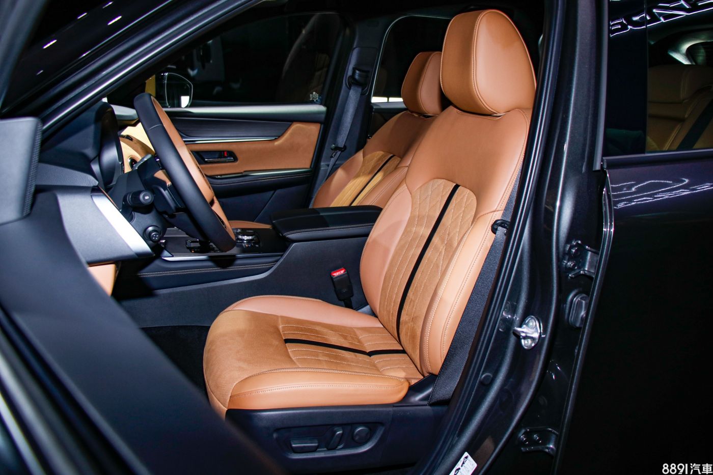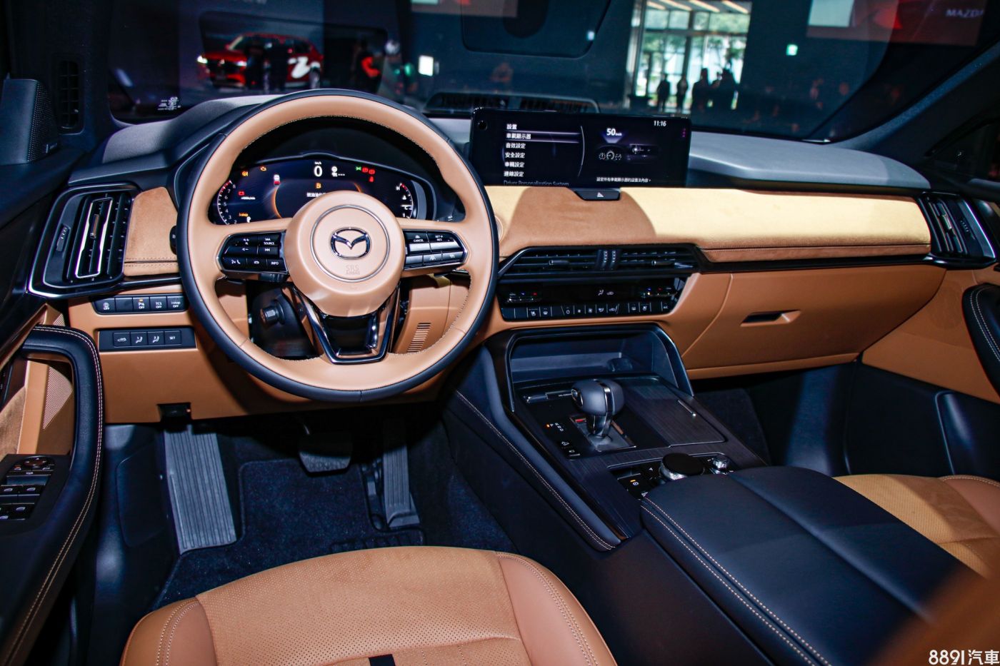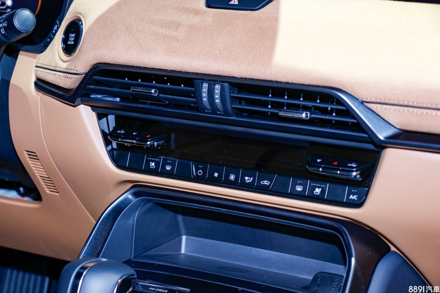 座艙格局與品牌旗下多數新車格局類似,同樣都是以水平與框形線條鋪陳,包含儀錶臺、車門板等處,皆以軟塑料或皮革包覆提升質感,展示的33T AWD車型還選配有「Premium Sport」暖沙棕內裝,不僅中控台改搭棕色麂皮材質,排檔座亦換上黑色髮絲紋飾板,高級氛圍堆疊感十足!