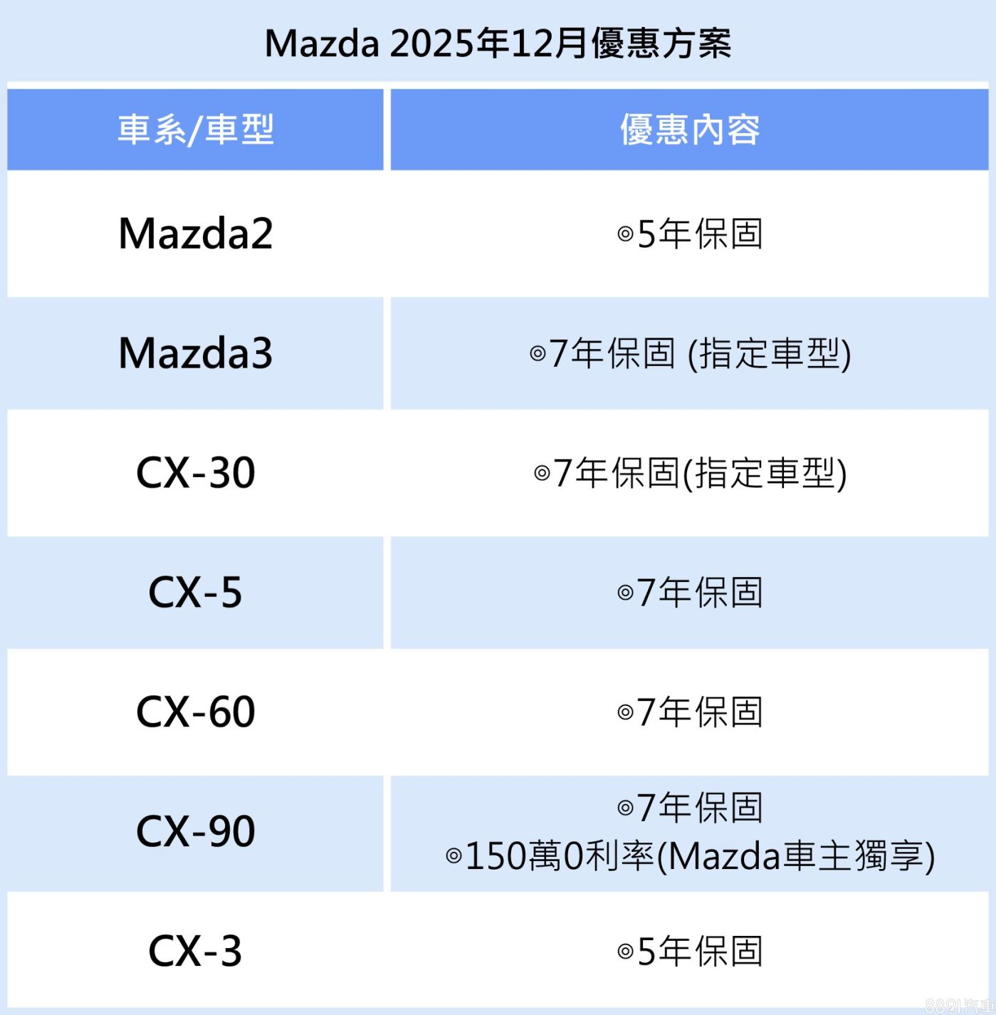 迎接歲末之際,台灣Mazda限時推出12月入主Mazda3、CX-30雙車系指定車型、CX-5、CX-60、CX-90全車系,即可升級7年原廠保固,享有免費且不限里程的完整守護。此外,CX-90還可享專屬車主禮遇,提供150萬元高額0利率優貸方案。
