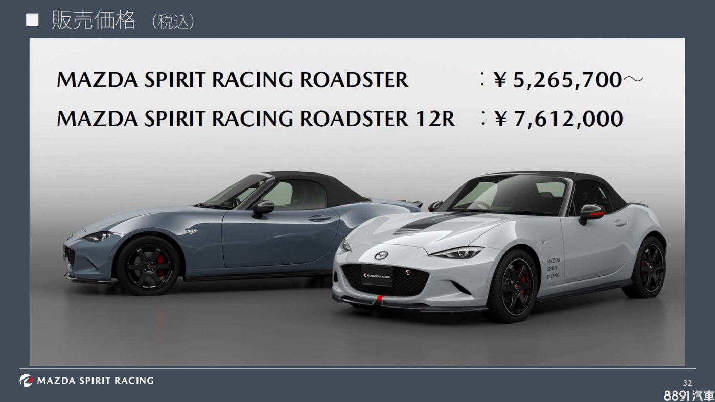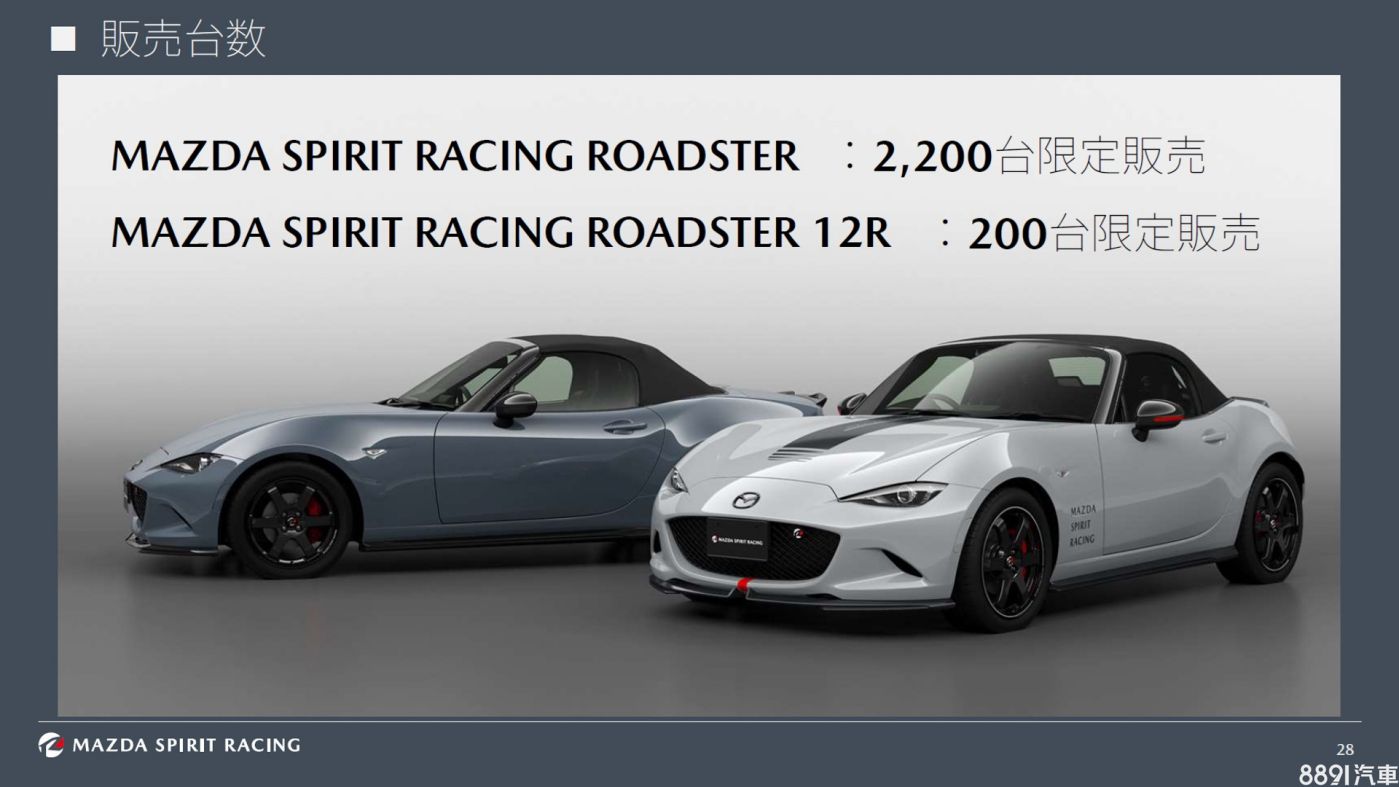 馬自達於2025東京改裝車展發表、由旗下賽車部門量身打造的Mazda Spirit Racing Special Model近日終於發表上市,率先推出MX-5 Spirit Racing與MX-5 Spirit Racing 12R,售價分別為526.57萬日圓(約新台幣104.7萬)與761.2萬日圓(約新台幣151.4萬),日本當地各限量供應2200輛與200輛,其中頂規12R將以抽籤方式決定獎落誰家。