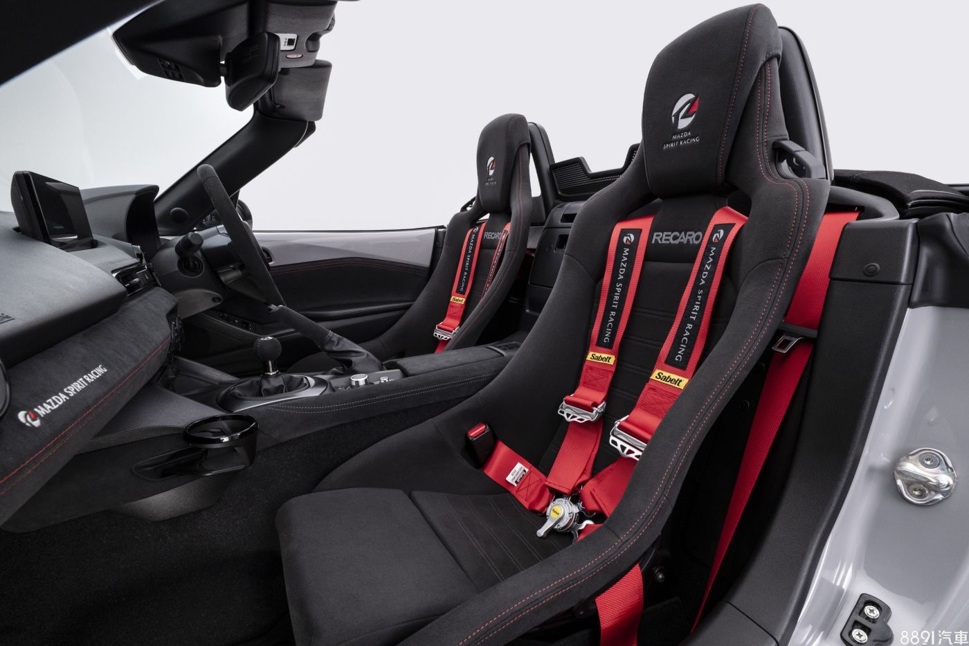 MX-5 Spirit Racing採用專屬亮黑色空力套件與鍛造鋁圈,軟篷有6種車色可選、12R僅供單一車色,引擎蓋與行李廂蓋有類賽車飾貼,並在保桿、後視鏡蓋添加紅色飾條做為區隔。