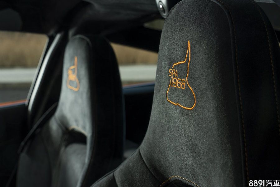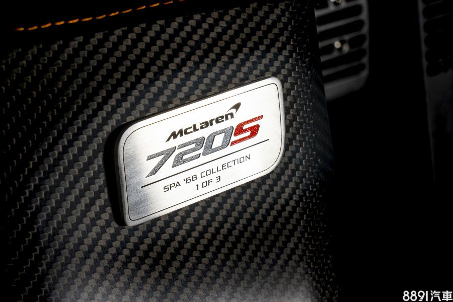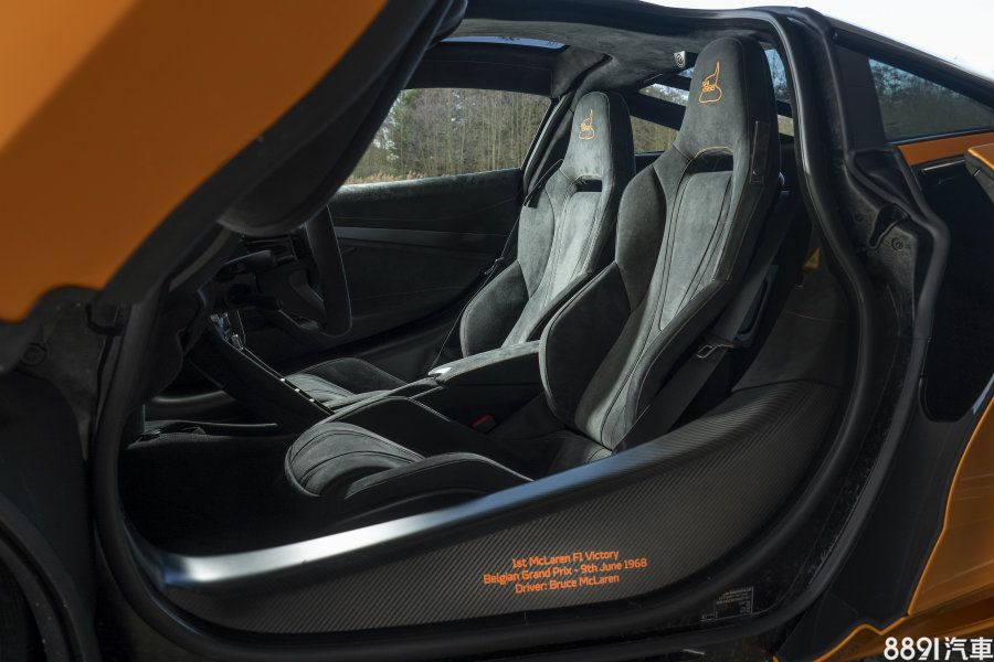 內裝方面變動細微,除了在碳纖維單體座艙外緣,鑲上「McLaren F1車隊首勝-比利時GP賽事-1968/6/9」等字樣之外,麂皮前座頭枕也搭配「SPA 1968」橘色刺繡,而在駕駛側下方也有專屬金屬紀念銘板,凸顯不凡之處。