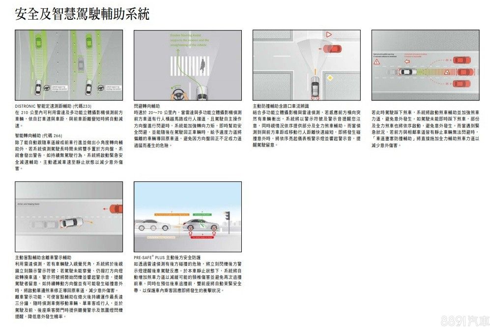 23P智慧駕駛輔助套件包含了Distronic智能定速測距輔助、智能轉向輔助、閃避轉向輔助、主動防撞輔助含路口車流辨識、行人偵測及車道壅塞防撞輔助、主動盲點輔助含離車警示輔助、主動車道維持輔助,以及Pre-Safe Plus主動後方安全防護等系統。