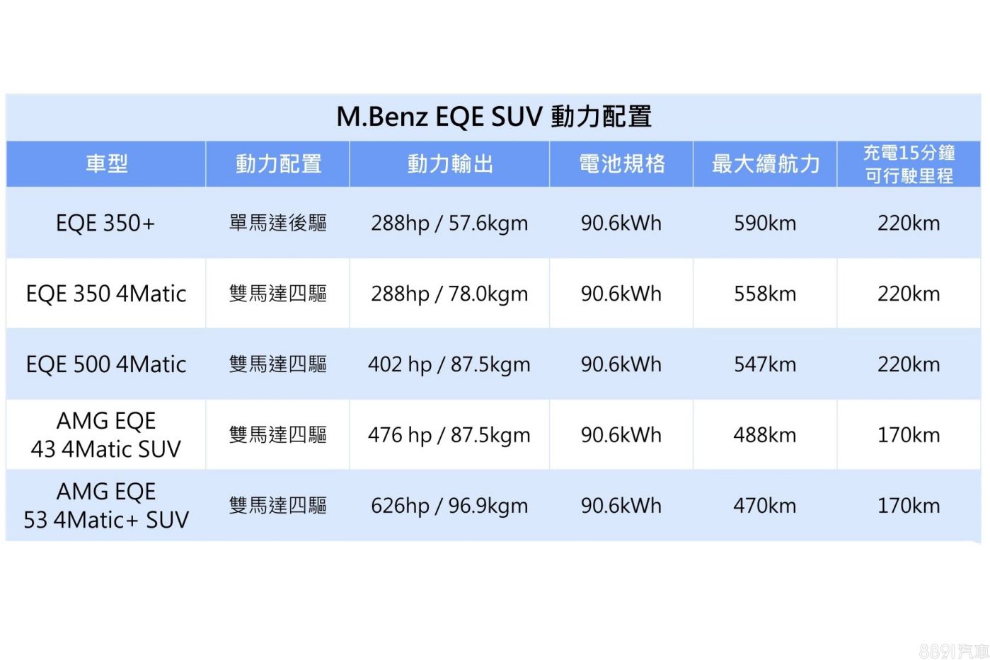 EQE SUV在國外擁有豐富的動力選項,全車系標配90.6kWh鋰電池組,最大續航力視車型落在470~590km。