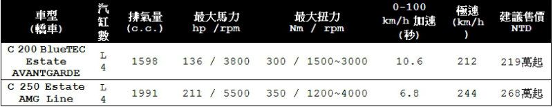比照The new C-Class多元面向的產品編成,考量台灣市場對於旅行車款的各種需求,針對The new C-Class Estate台灣賓士提供了一汽一柴兩種動力車型,其中柴油車款為C 200 BlueTEC Estate AVANTGARDE,汽油車款則為C 250 Estate AMG Line,售價分別為新台幣219萬元與268萬元起。