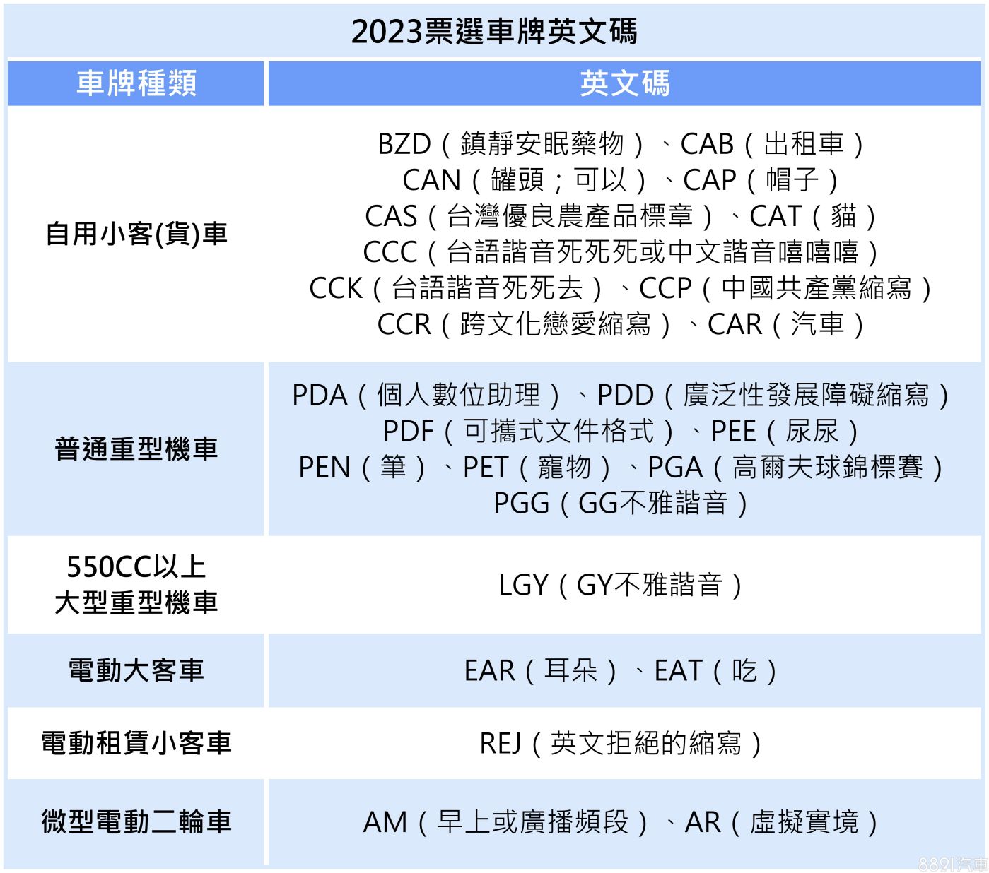 交通部每年都會針對隔年即將發放的車牌進行調查,希望能夠提前汰除民眾反感的車牌編碼,今年共整理出26組具有特殊諧音或含義的英文編碼,將於3/1~4/30號開放民眾至監理服務網線上票選。
