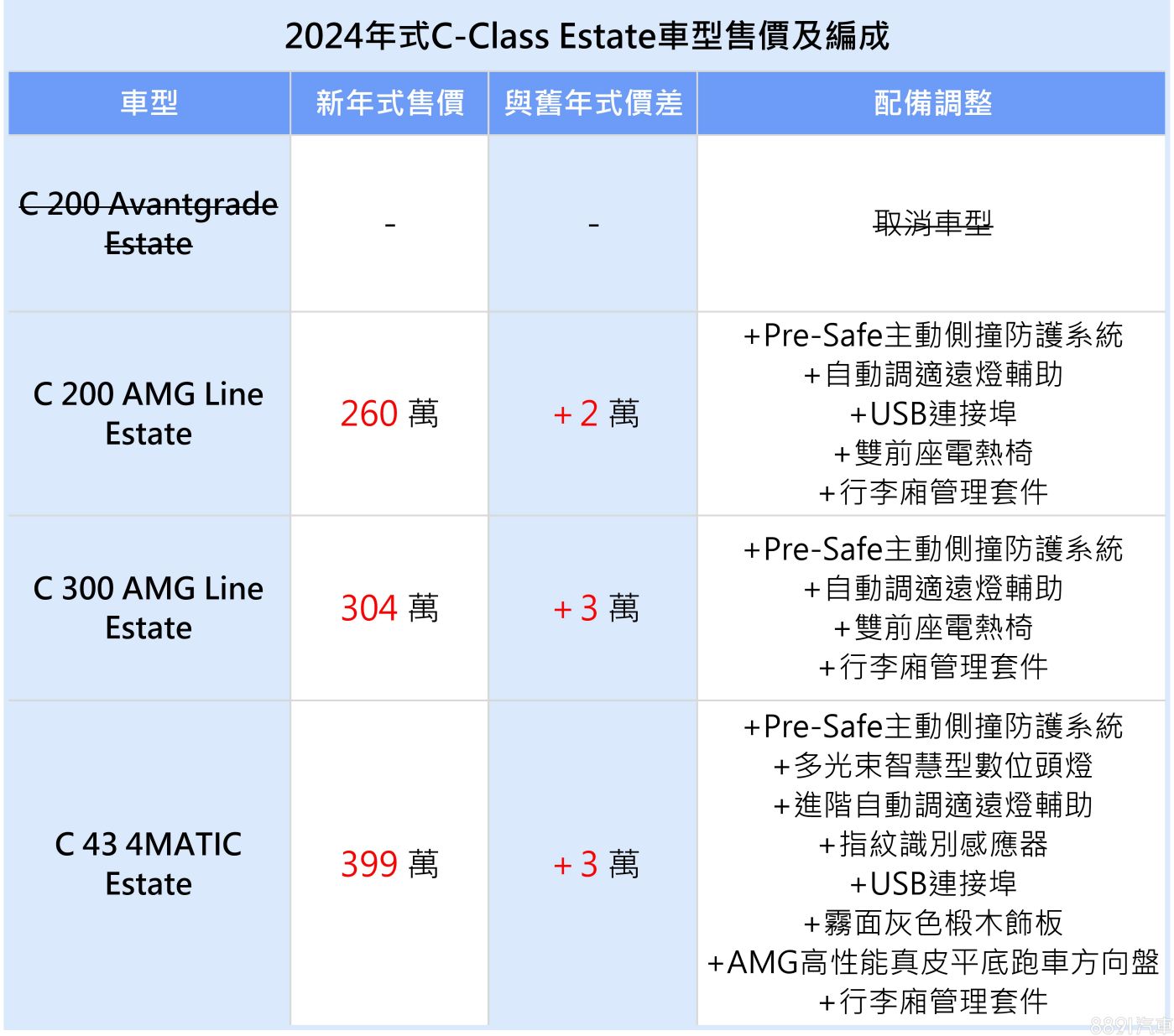 五門Estate則取消入門車型,其餘均迎來2~3萬的漲幅,除全車系標配AMG Line套件外,也導入與四門Sedan相同的配備,包含自動調適遠燈輔助系統、雙前座電熱椅、USB連接埠等,並額外新增行李廂管理套件。