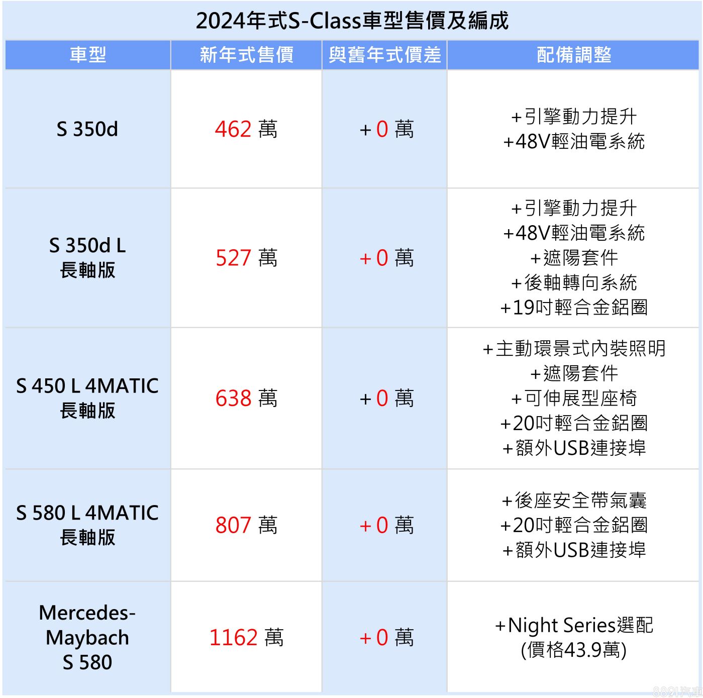 S-Class則針對柴油350d、350d L長軸版更改引擎型號,輸出由原本的286hp/61.2kgm,提升至313hp/66.2kgm,並全面導入48V輕油電系統;另外Mercedes-Maybach S 580也新增Night Series選配件,要價43.9萬元。