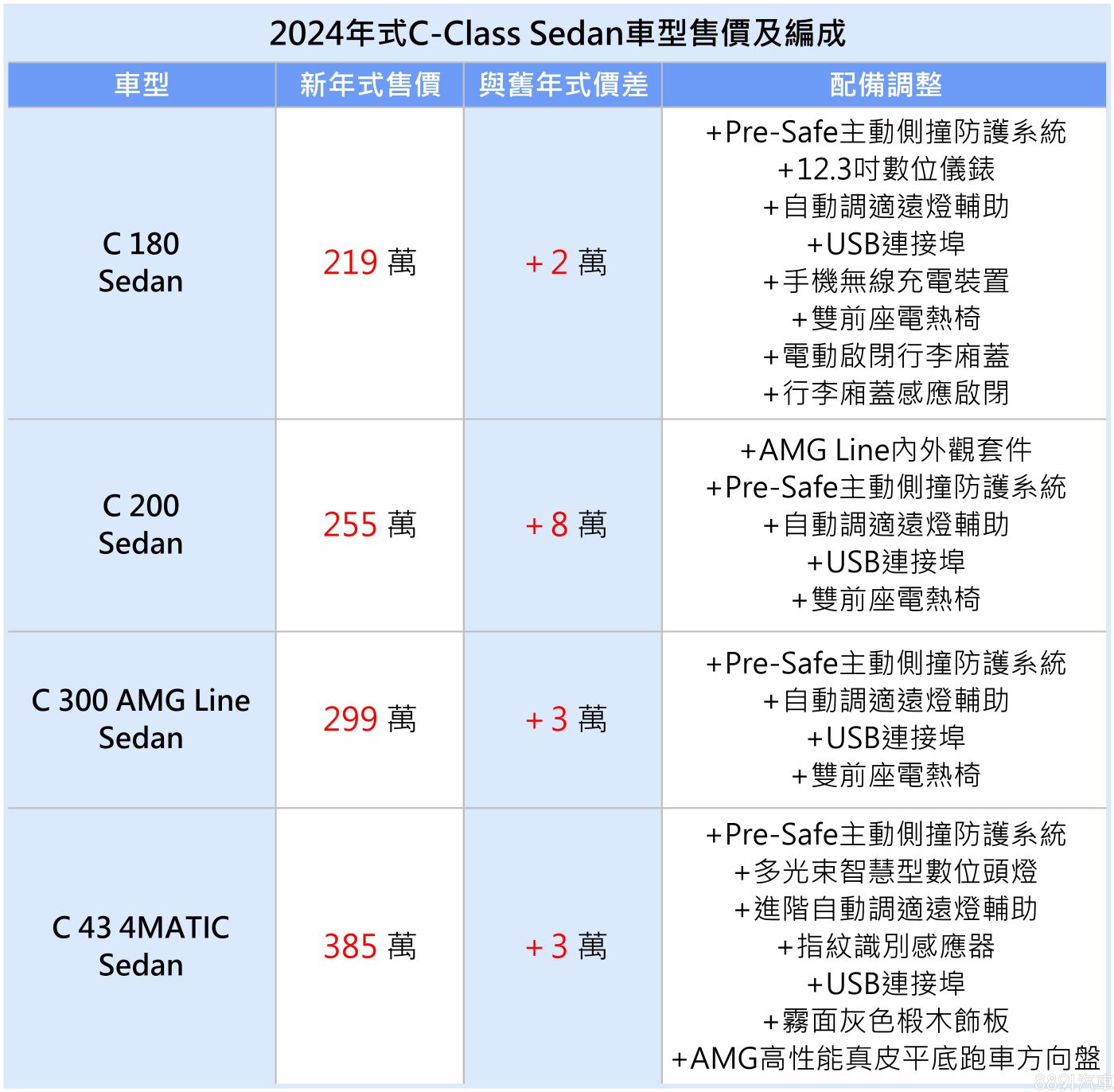台灣賓士近日針對旗下C-Class、S-Class車系推出新年式更新,其中C-Class全車系增列Pre-Safe主動側撞防護系統,四門Sedan各車型亦有新增配備,C 180主要導入12.3吋數位儀錶、感應式電動尾廂蓋;C 200則將AMG Line套件列為標配,性能車型C 43也追加多光束智慧型頭燈,然售價也有2~8萬的漲幅。