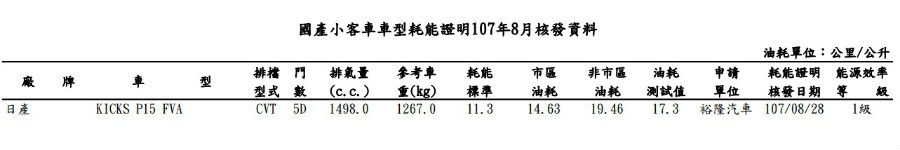 預計10/13開放預售的Nissan Kicks搭載1.5升自然進氣引擎,搭配CVT無段變速箱,繳出市區14.63km/L、非市區19.46km/L、平均油耗17.3km/L的亮眼成績,為1級能源效率等級認證。