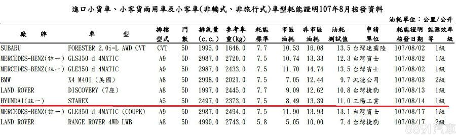 此外,今年初在韓國發表的Hyundai小改款Grand Starex,則擁有市區8.49km/L、非市區13.39km/L、平均油耗11km/L的成績,為1級能源效率等級認證,也較現行的10.4km/L略為進步。