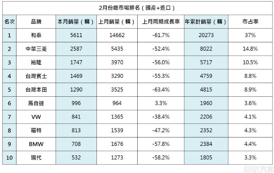 適逢農曆新年與228假期,僅有15個工作天的二月,銷售表現下滑為預料之中,不過不僅較上月有著多達55.8%的降幅,更比去年同期下滑27.7%,榜上自然呈現「滿江紅」狀態。