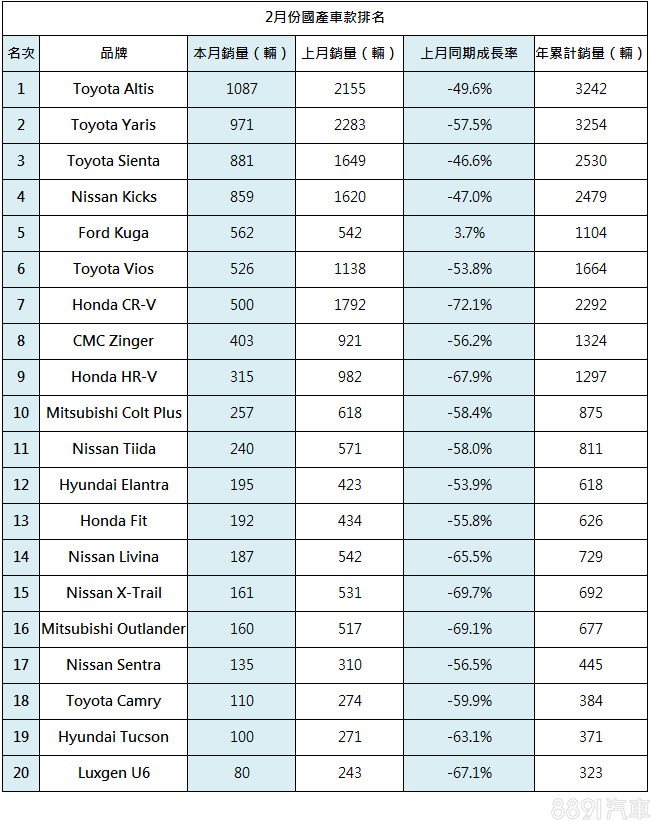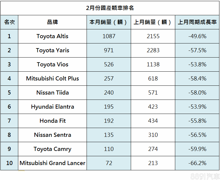 即便面臨改朝換代,在台灣有神車之稱的Altis,就算有著將近50%的跌幅,依舊穩居2月份國產轎車市場冠軍,更是2月份國內汽車市場中,唯一一款銷量破千的車系!
