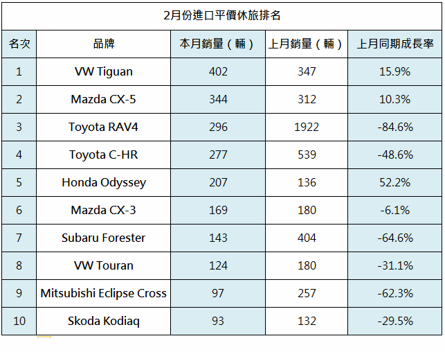少了RAV4競逐,進口平價休旅在2月以VW Tiguan銷量最為亮眼,不僅登上排名冠軍,402輛的成績相比1月也有著15.9%成長,反應VW銷售策略調整成功。Mazda CX-5也是少數逆勢成長的車款,成長幅度來到10.3%;七人座MPV Honda Odyssey銷量更成長52.2%,持續保有暢銷地位。