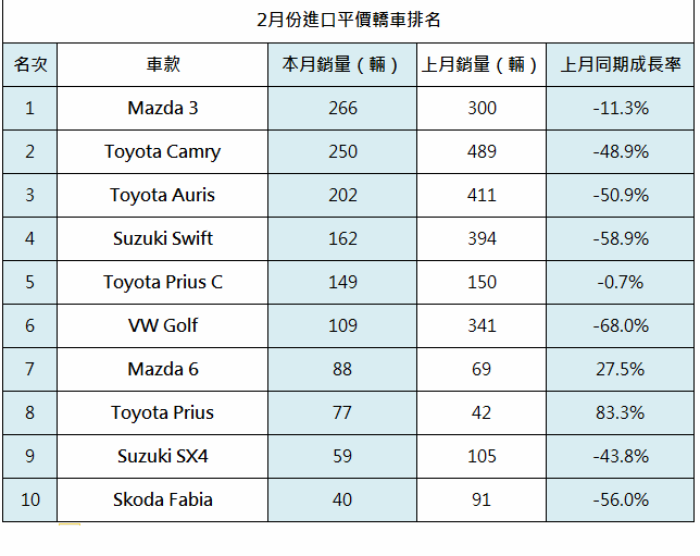 Mazda 6以進口中大型房車之姿保有不錯的銷售力道,在普遍衰退中逆勢成長達27.5%;令人意外的是一向保有穩定銷量的VW Golf在2月衰退最為劇烈,僅109輛、跌幅高達68%,產品末期吸引力略低是否影響銷量值得持續觀察。