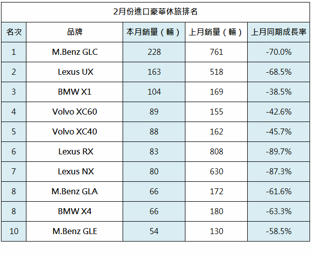 以往排名靠後的BMW X1在2月衰退幅度較緩,以104輛躍升排名第3,同樣在此波衰退中表現較為突出的尚有Volvo XC60、XC40,分別排名第4與第5。值得注意的是Mercedes-Benz GLE在2月依然繳出54輛銷售成績,以屆齡改款身分來說表現亮眼,未來新款GLE將提供GLE 300d、GLE 350d和GLE 450三款動力,入門四缸版本起跳價可望落在300萬以內,延續熱銷氣勢。