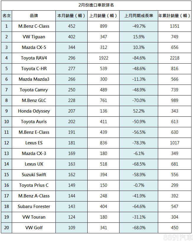 而受到常勝軍RAV4改款期程「讓賢」,C-Class雖然銷售表現較上月衰退49.7%,但依然以豪華品牌之姿榮登2月進口銷售冠軍,表現勝過平價進口車款是較為有趣之處;綜觀進口車市場前10名榜單,VW Tiguan、Mazda CX-5與Honda Odyssey等休旅氣息濃厚的車款在一片逆勢中維持銷售增長,反應國內新車買家需求依然強烈。