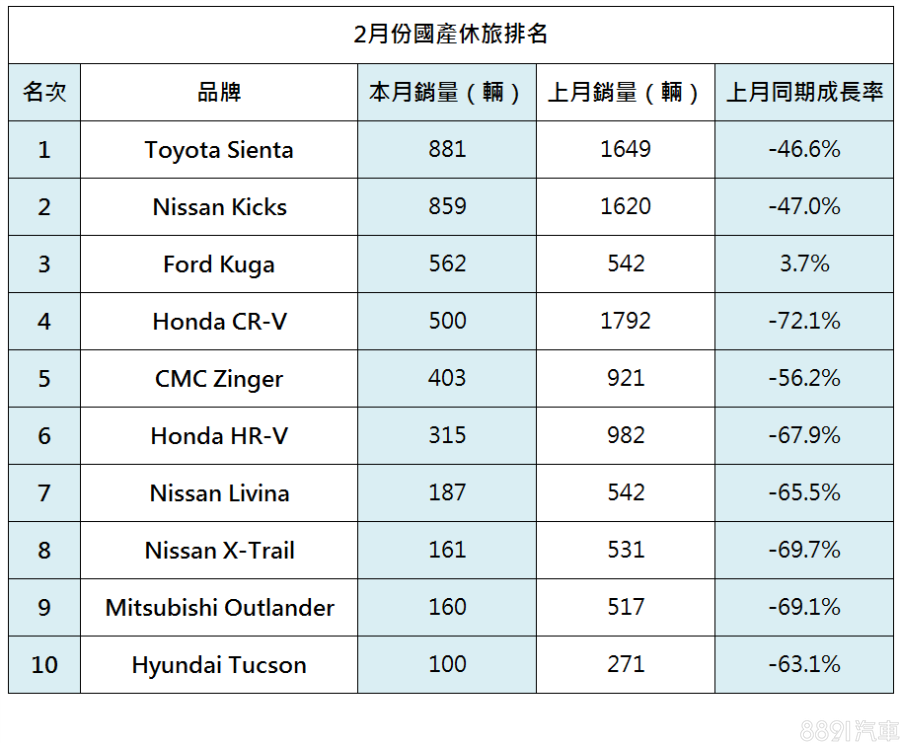 在國產休旅市場中,原本據首的CR-V由於僅繳出500輛銷量,落到了三名之外,讓原本名次就不低的Sienta、Nissan Kicks及Ford Kuga於本月分別攻占冠、亞、季軍位置。