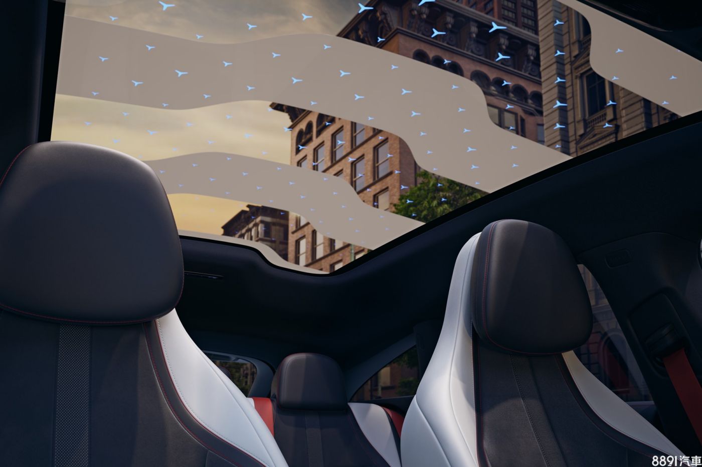 大面積的車頂不用可惜!因此原廠為新CLA Shooting Brake帶來玻璃車頂,可視需求分區調整透明度,甚至結合環艙氣氛燈,讓車頂內嵌品牌象徵的158顆三芒星,能隨氣氛燈色彩同步點亮,這可是CLA房車所無福享受的。