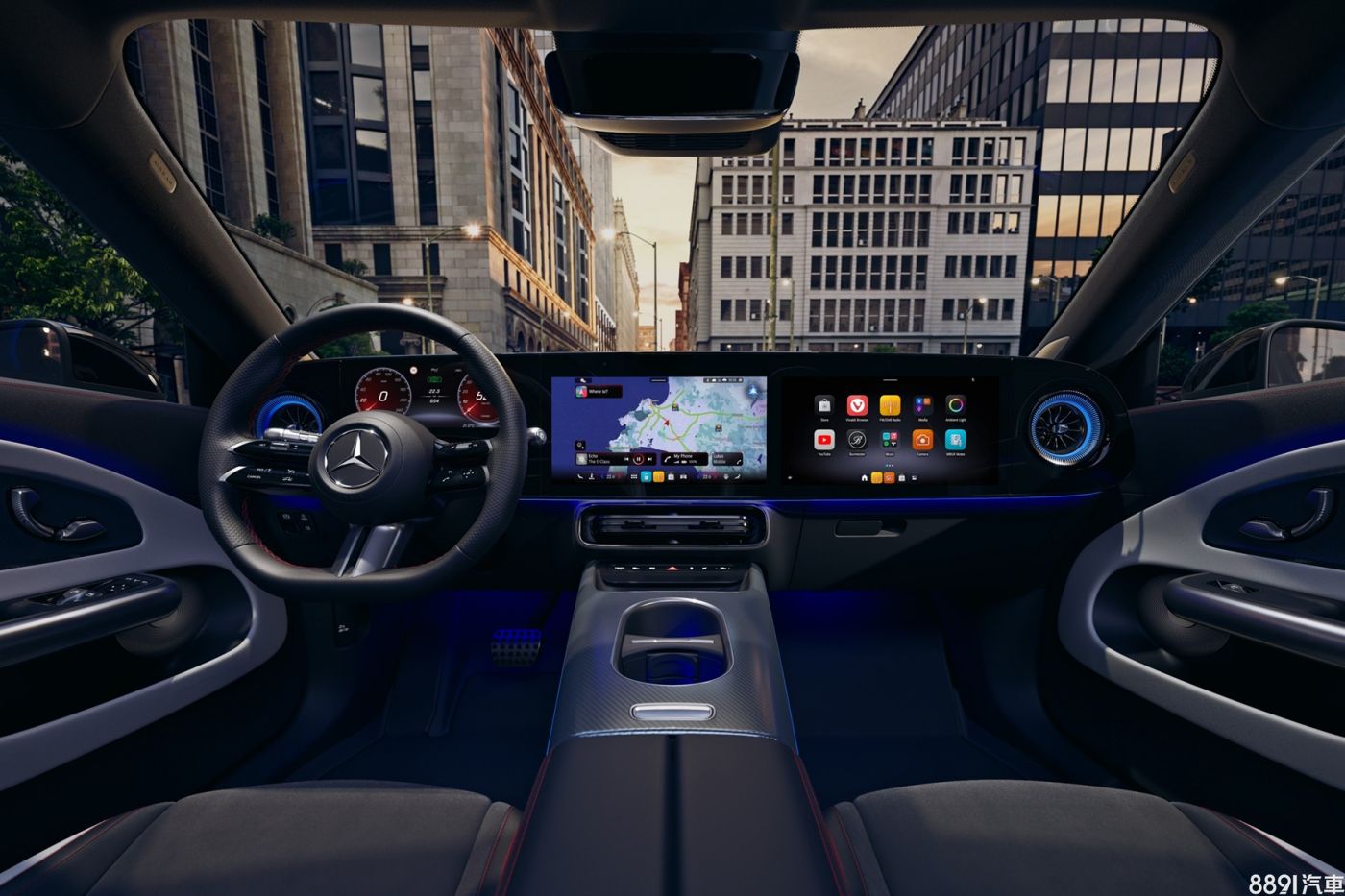 座艙格局與CLA如出一轍,以橫向布局為主,風格簡潔清爽,10.25吋數位儀錶和14吋觸控車機內建新開發的MB.OS作業系統,內建AI虛擬助理,能接受更口語的指令,應對上也更加自然,部分市場並預計提供14吋副駕觸控車機作為加價選配。