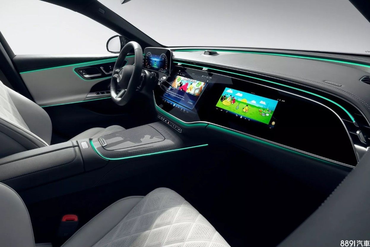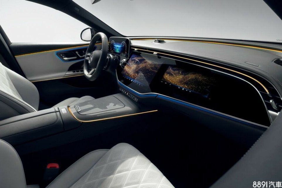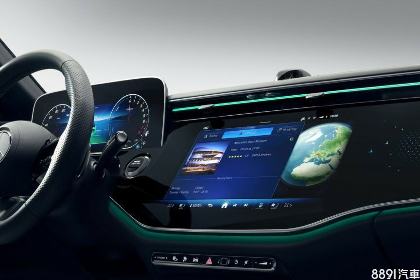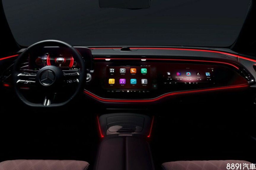 大改款E-Class車室重點是導入取材自MBUX Hyperscreen設計的大尺寸觸控式顯示幕,和新S-Class很像、卻不一樣,雖同樣有儀錶、中央多媒體系統、副駕駛座前方三具螢幕,但數位儀錶為獨立設置,並未和另外兩具螢幕整合在一起,目前尚未公布螢幕尺寸,但肉眼能看的出來,中央螢幕尺寸比起「大S」更小了一些,原廠將新車的多媒體系統依舊名為MBUX。