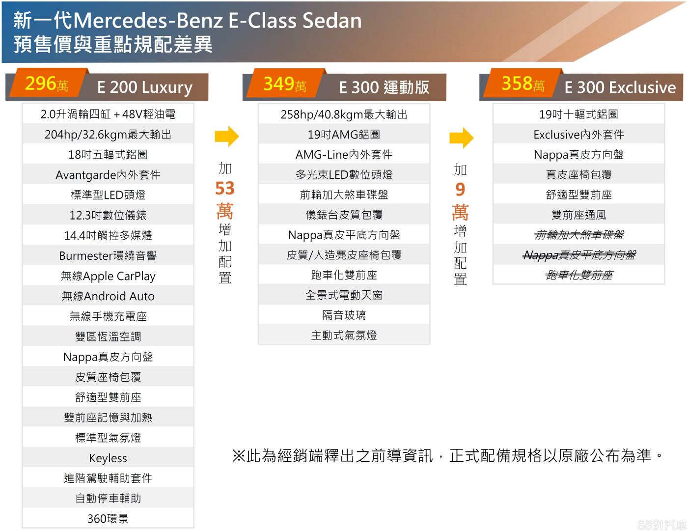 台灣賓士今(11/1)正式公布新一代E-Class預售資訊,首波規劃四門版E 200 Luxury、E 300運動版、E300 Exclusive共三車型,接單價分別為296萬、349萬及358萬,並預告國內正式發表將會落在12/7號。