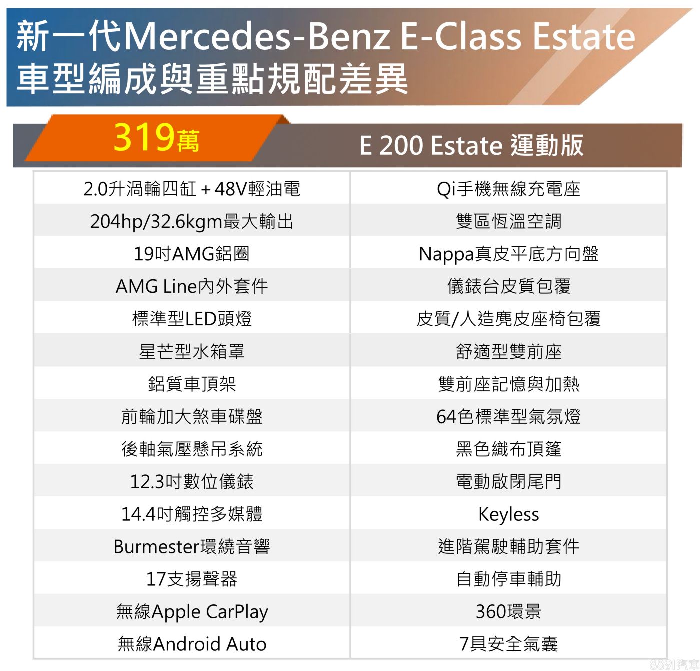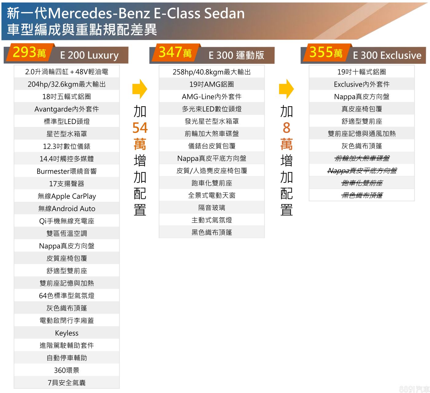 國內新一代E-Class首波規劃四門版E 200 Luxury、E 300運動版及E300 Exclusive三車型,正式售價分別為293萬、347萬、355萬,各車型較預售價再降3萬、2萬及3萬元,並同步帶來一款五門旅行車E 200 Estate運動版,開價319萬,各車型預計於12月底開始交車。