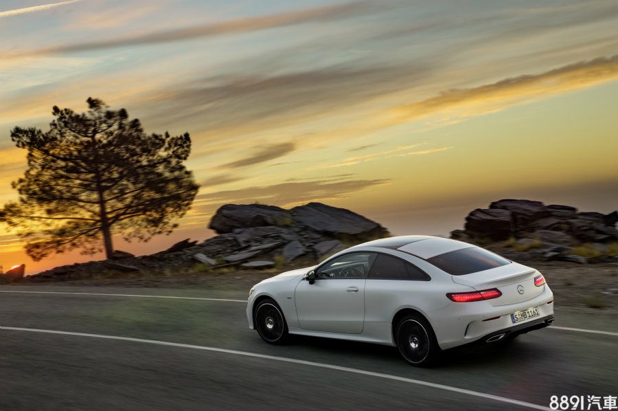 從車頭望去,E-Class Coupe面容與四門版可說是完全相同,前保桿、頭燈、水箱護罩輪廓都難以看出雙門與四門的差異,不過E-Class Coupe引擎蓋多了兩條立體線條,成為車頭辨識身分的最明顯處。為了與C-Class Coupe做出明確區隔,新車型不再延續C-Class底盤基礎,改用W213結構進行發展,比起舊款,新車型軸距由過去的2760mm增長至2873mm,身長也由4703mm變為4826mm,視覺上必然更為修長,而車尾的燈組設計則採用自S-Class Coupe首度出現的狹長式設計,這已成賓士跑車系列的車尾特徵,至於上一代在後葉子板上的立體陵線,新車型將其撫平,不過由於保有相當曲度,因此視覺上仍不顯單調,至於無窗框造型仍舊保留下來,且後座側窗也可降下,只是因面積頗大,接近C柱處將後座側窗分割,這設計在上一代就可見到,新車型也繼續維持,似乎有成為外觀特點之一的感覺。