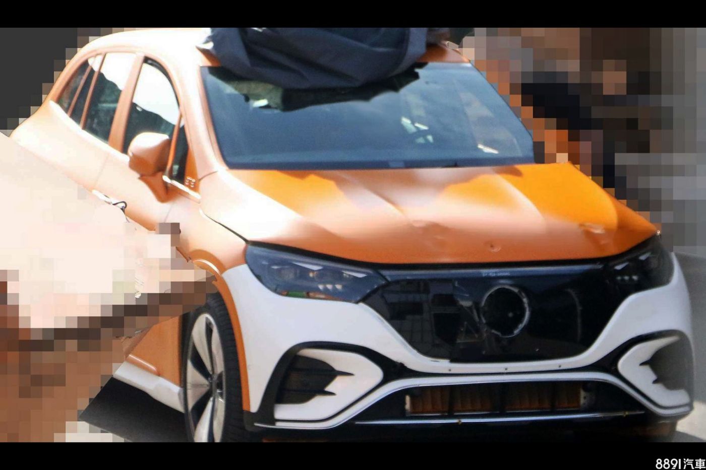 這不是計程車!曝光的EQE休旅,從造型完整度來看,應已相當接近量產市售版本,而外觀主要鈑件包覆橘黃色貼膜,保桿破損且引擎蓋變形,推測是剛功成身退的撞擊測試用車。