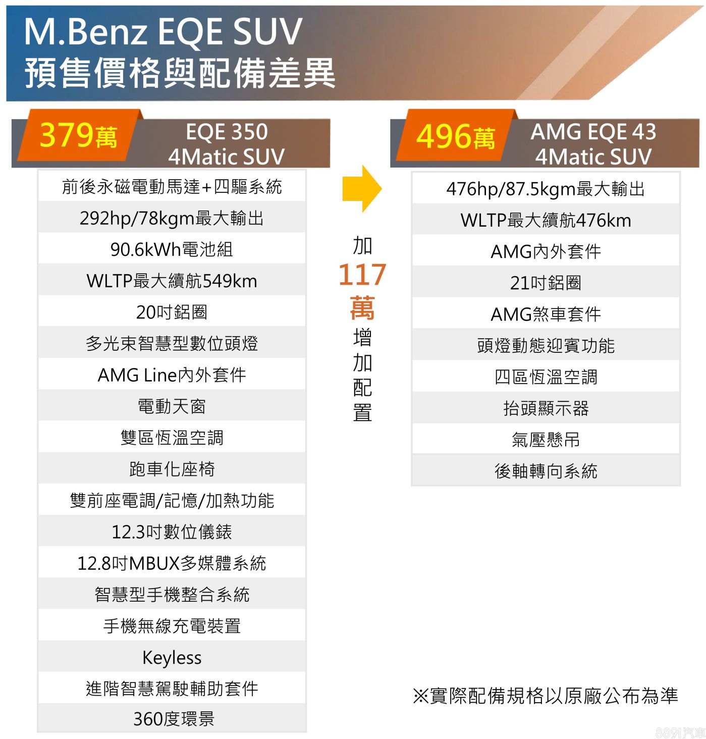 小一號的EQE SUV,計畫導入「EQE 350 4MATIC SUV」和「AMG EQE 43 4MATIC SUV」兩種選擇,皆採雙馬達四驅架構和90.6kWh電池組,前者輸出292hp/78.0kgm,具備549km續航力;後者出力可達476hp/87.5kgm,0~100km/h加速僅需 4.3秒。兩車型同樣已有經銷端資訊曝光,但完整規配資訊仍待後續正式公布。