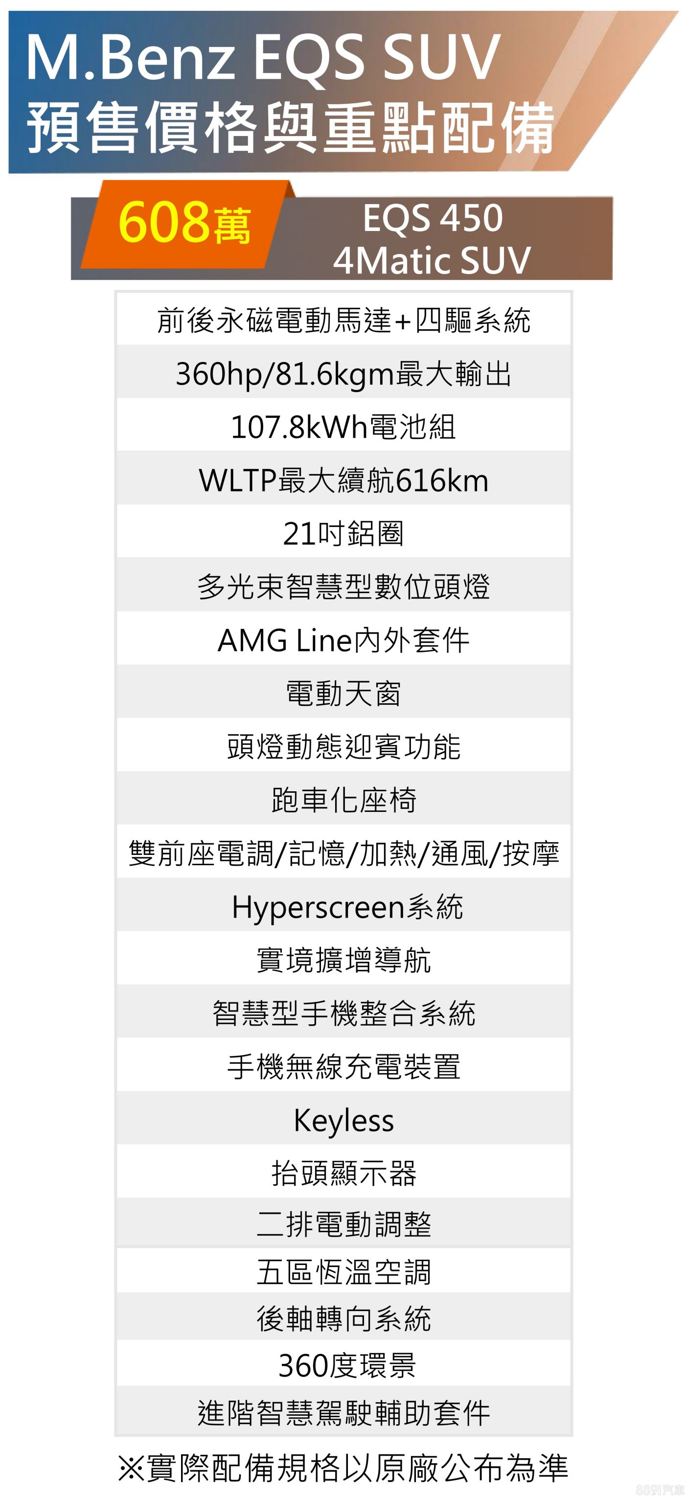 較高規的EQS SUV,國內僅供應「EQS 450 4Matic SUV」七人座單一車型,預售價608萬,原廠未公布完整規格,但表示採雙馬達四驅配置,WLTP標準下續航里程上看616km。而參考早先經銷端資訊,預計裝載107.8kWh電池組、最大輸出360hp/81.6kgm。