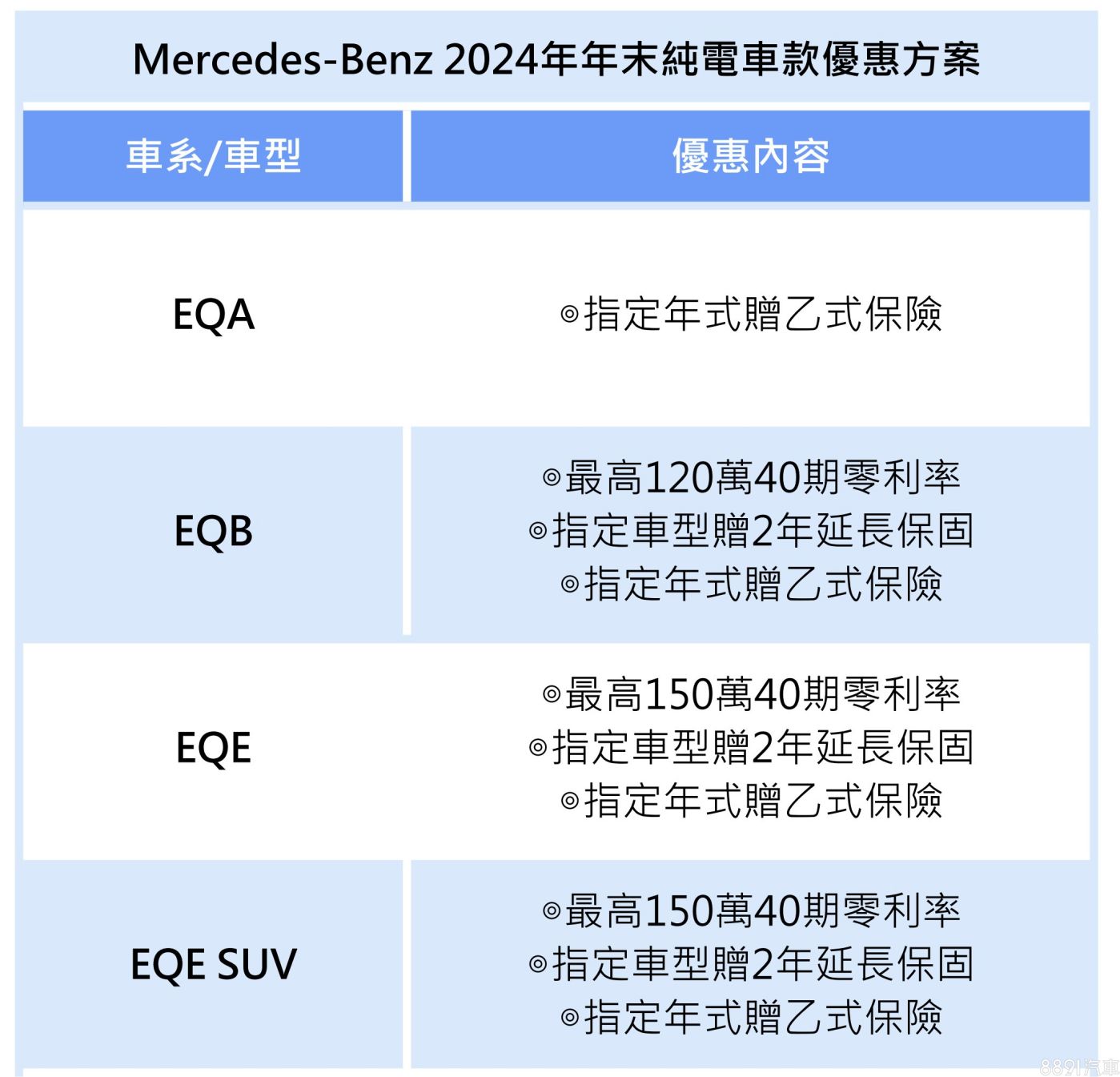 活動期間入手上述四款車系指定年式車型,均加贈乙式險;若購入EQB、EQE或EQE SUV之指定車型,還額外加贈2年延長保固。