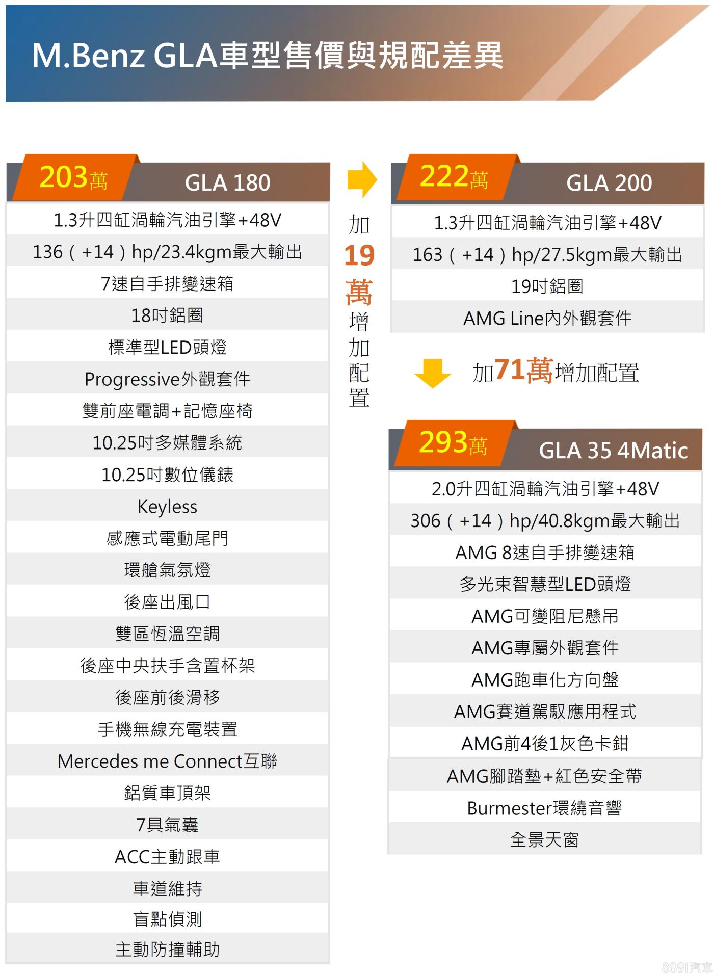 海外今年3月推出的小改款GLA車系,今(9/26)正式在台上市,國內共提供三種動力車型,包含GLA 180、GLA 200以及掛上AMG的GLA 35 4Matic,售價分別為203萬、222萬及293萬。