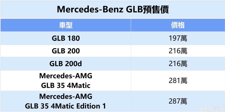 目前首波的導入名單當中有GLB 180、GLB 200d、GLB 200、AMG GLB 35 4Matic,總共四款動力規格,GLB 35還有推出限量版的Edition 1版本,預估最快下半年就會開始交車。