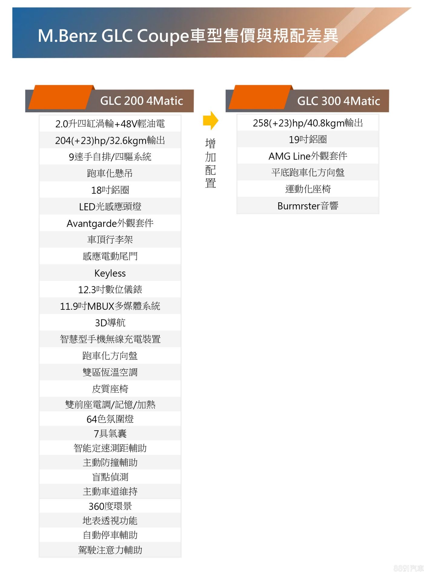 據銷售端消息,大改款GLC Coupe首波提供GLC 200 4Matic、GLC 300 4Matic兩車型,均採2.0升四缸渦輪引擎+48V輕油電配置,搭配9G-TRONIC九速手自排變速箱,以及四驅系統,分別可產生204hp/32.6kgm、258hp/40.8kgm之最大出力,微油電系統則可提供23hp的額外輸出。