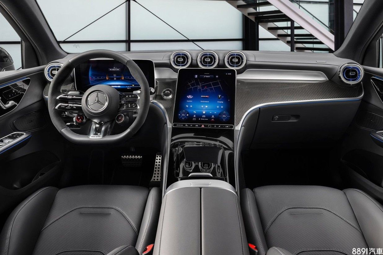 內裝延續AMG GLC標準款格局,同樣藉由AMG專屬方向盤、碳纖維風格飾板增添運動氛圍,標配12.3吋數位儀錶和11.9吋觸控多媒體系統,並提供HUD抬頭顯示器可加選,並導入AMG專屬風格顯示介面。