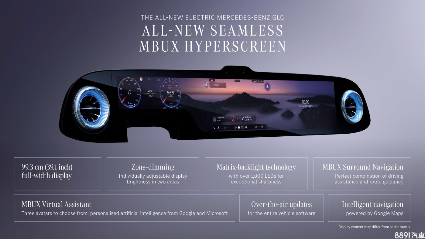 首波釋出GLC 400 4MATIC車型,動力採800V高壓系統,搭配94kWh容量鋰電池,為高功率直流快充與高效熱管理打下基礎,可在10分鐘內補充303km的續航里程,也配置直流轉換器,因應400V不同快充情境,以符合最佳效率。
