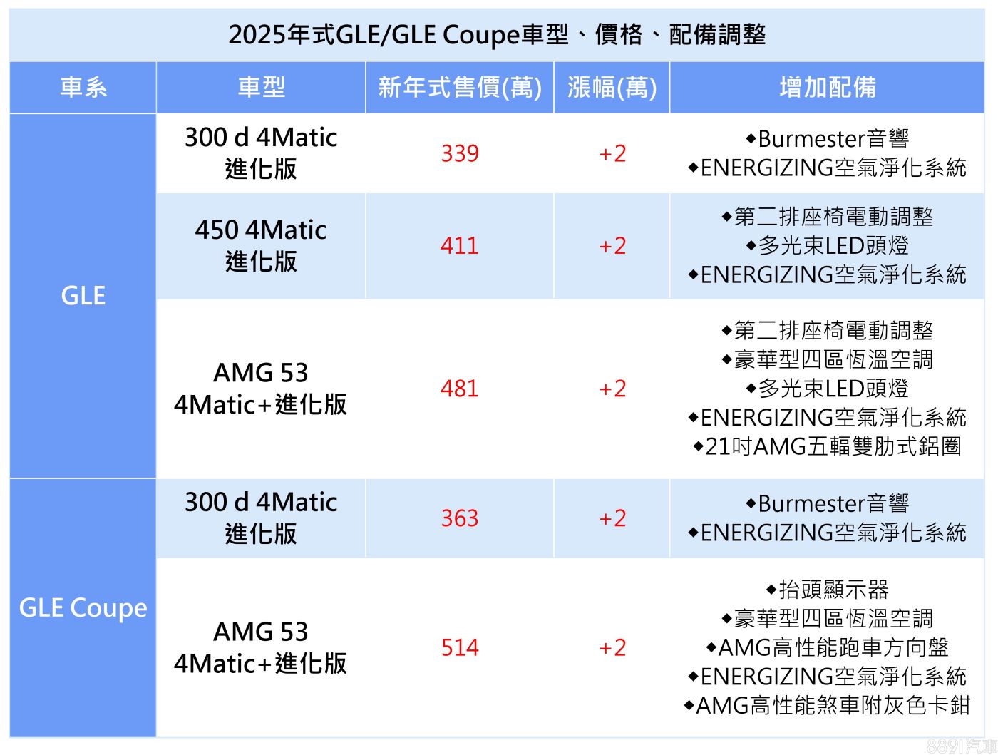 2025年式GLE編成不變,GLE提供「300 d 4Matic進化版」、「450 4Matic進化版」、「AMG 53 4Matic+進化版」3車型,售價依序為339萬、411萬、481萬;GLE Coupe則有「300 d 4Matic進化版」和「AMG 53 4Matic+進化版」2等級,開價363萬與514萬,全車系都小漲2萬。