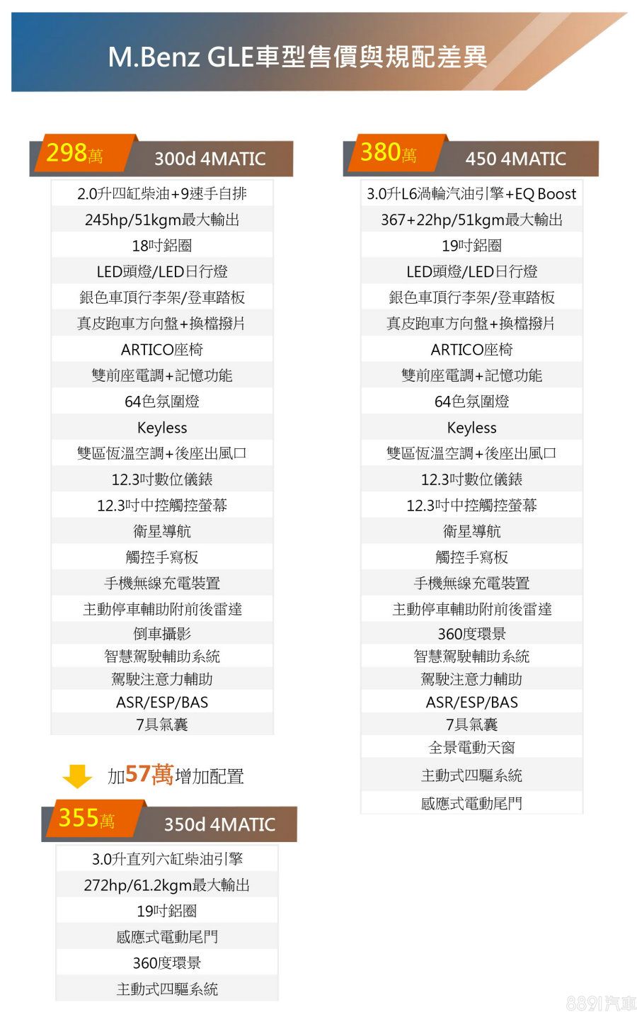 新一代GLE採GLE 300d 4MATIC、350 d 4MATIC、450 4MATIC共三車型編成,正式售價分別為298、355和380萬元。