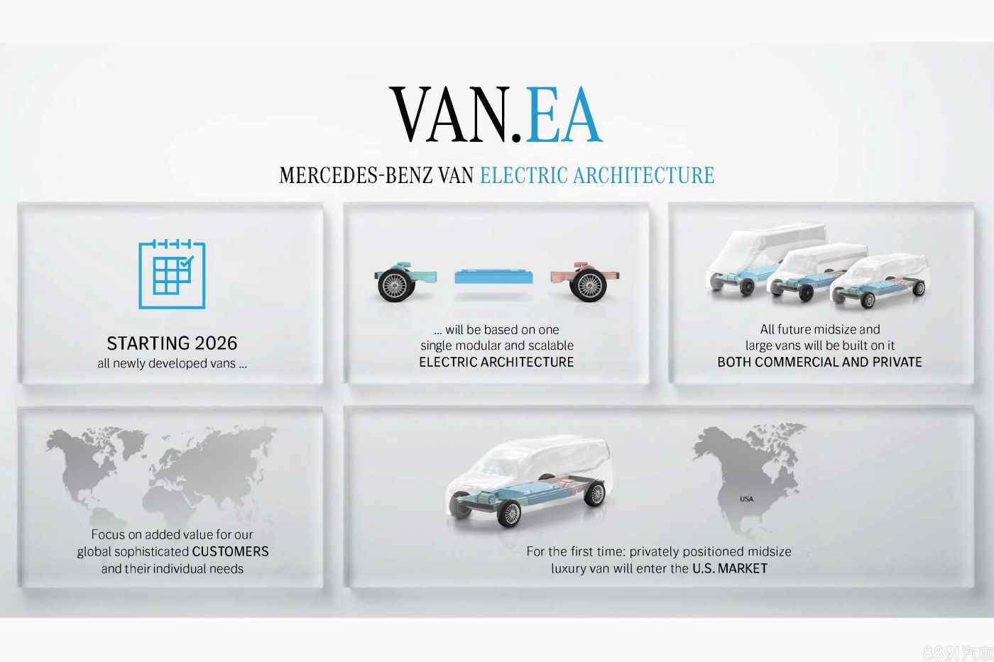 VAN.EA是款電動車專用平台,特別用來開發中型和大型的輕型商用車款(LCV),可生產廂型客車、廂型貨車、底盤車甚至露營車或私人訂製車款。