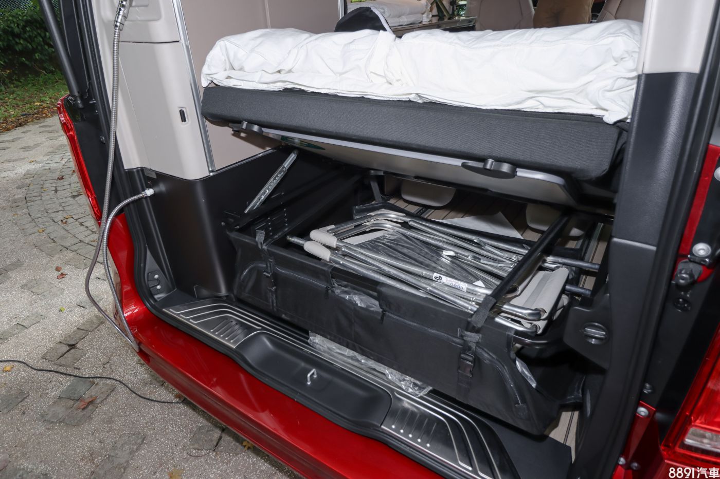 後座倒平後便可以創造出兩人平躺的空間,根據官方資料,臥墊尺寸為200×108cm、厚度為2cm,此外座椅下方備有抽屜,有一定置物容積,用來放小型家電、3C平板、小朋友玩具等雜物相當適合。