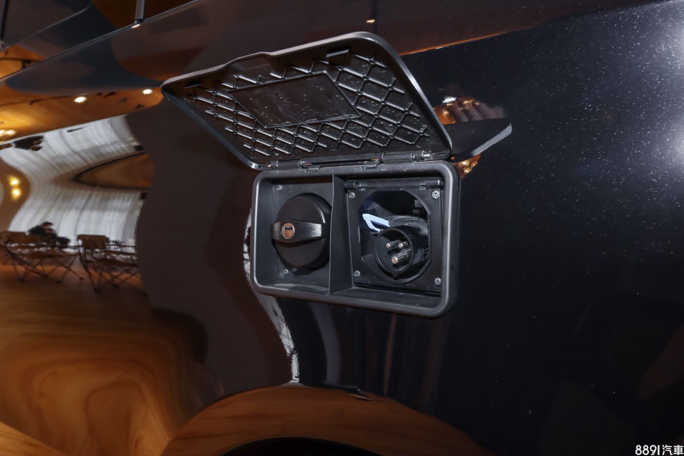 車側左後方、靠近輪拱上方,設有隱藏式蓋板,如圖所示左邊為注水口,用於補充淨水槽水量,右邊插座則可外接營地的電源,幫第二電瓶充電,停車露營時繼續供電給暖氣、冰箱、燈光等電器。