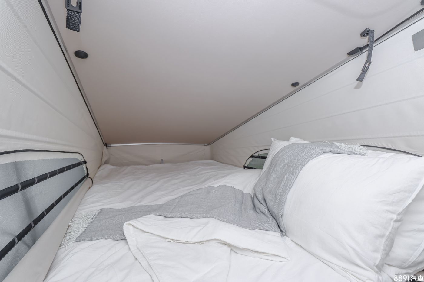 Marco Polo標配電動升降車頂,完全展開後可供2人平躺的休憩空間,附閱讀燈及USB充電孔可做使用,上層床鋪尺寸為205×113cm,承重上限為200kg。