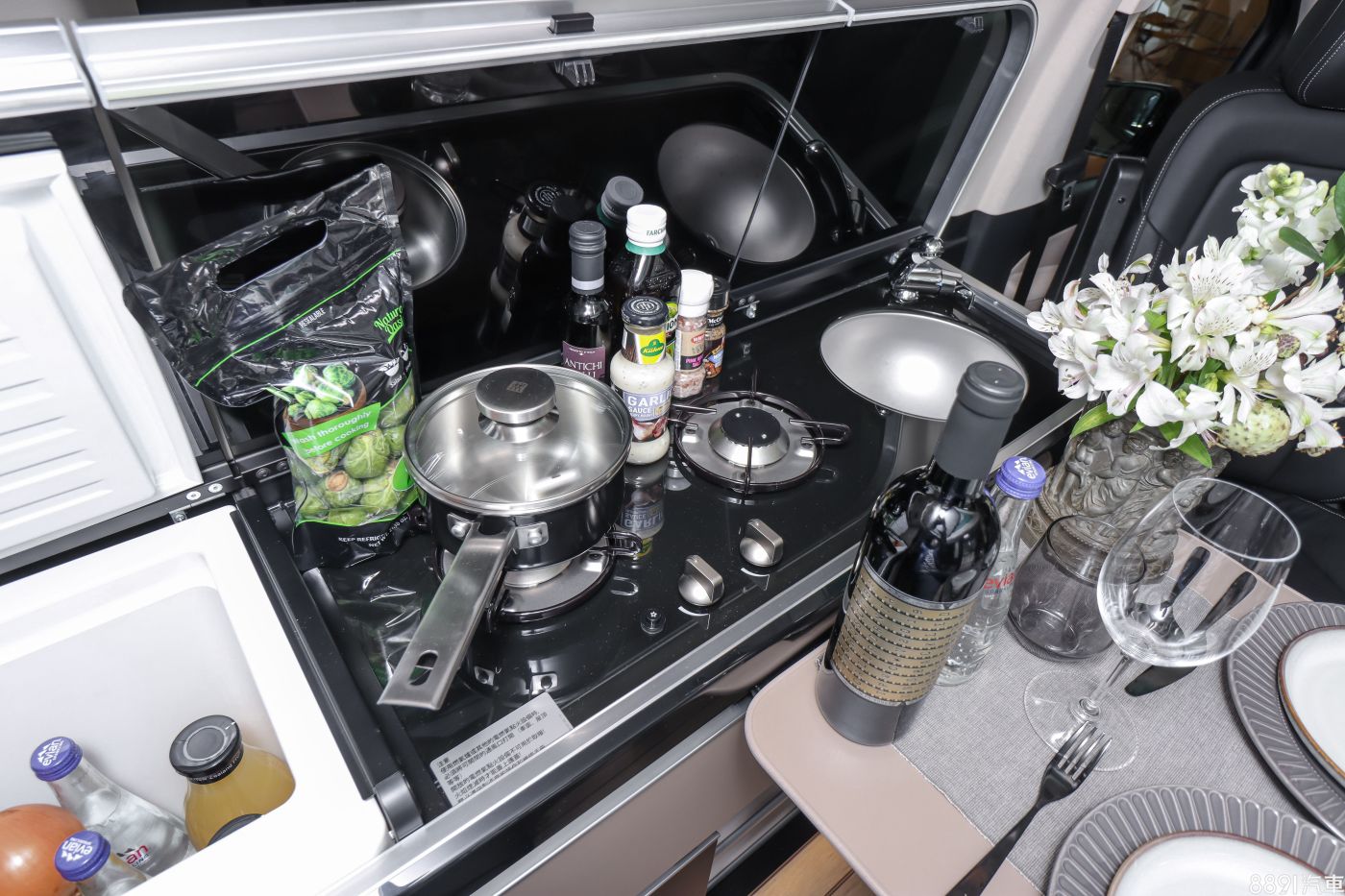 因應露營野炊的需求,Marco Polo配備簡易式廚房,提供雙口瓦斯爐、流理台、冰箱、38L的淨水槽與40L汙水槽等設備,地板採用遊艇式木紋飾板,能增添高級感,清理時也比較容易,可說是麻雀雖小、五臟俱全。