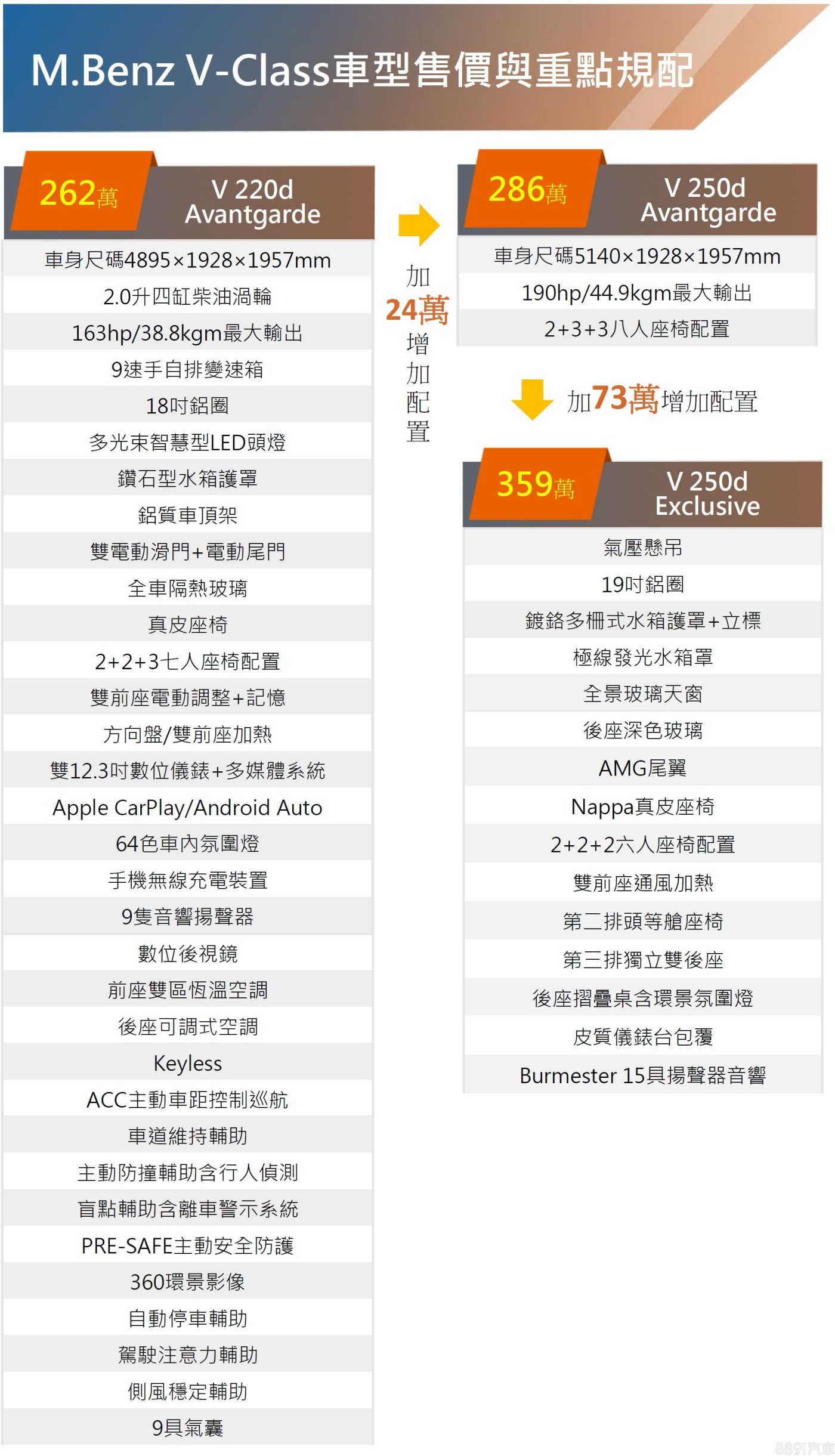 V 220d Avantgarde採用短車身設定與七人座配置,並標配雙電動滑門與電動尾門。V 250d Avantgarde則換上長車身設定,搭配更強的動力輸出與八人座配置,滿足企業不同的商務乘載需求。V 250d Exclusive則鎖定頂級商務需求,標配氣壓懸吊、第二排頭等艙座椅、Burmester音響等豪華配置,售價為359萬元。