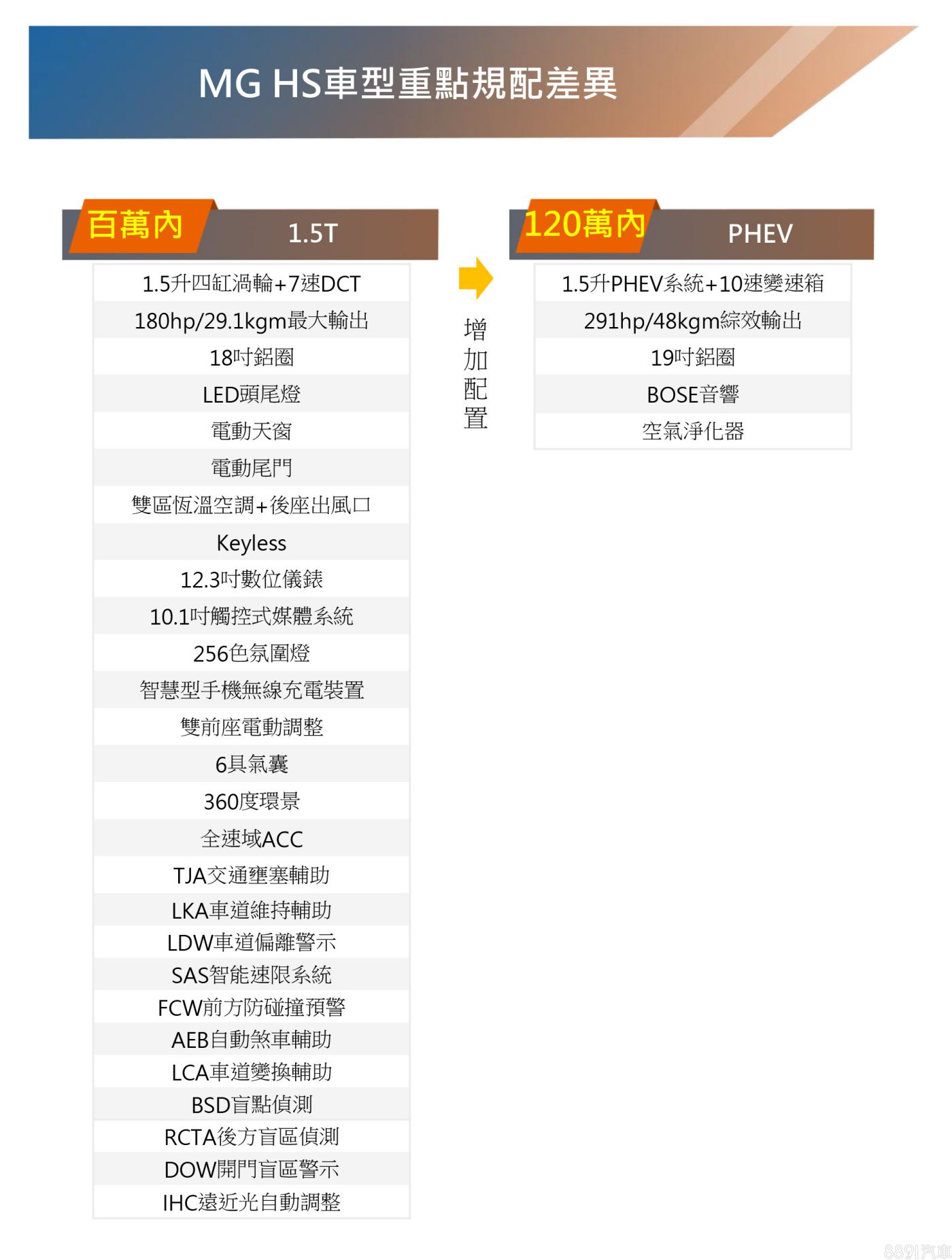 HS在台提供1.5升渦輪,以及以1.5升渦輪、電動馬達、16.6kWh鋰電池組架構而成的PHEV系統雙動力兩車型,新車接下來會進行媒體試駕活動,並於9月公布消費者最在意的價格資訊,可以確定入手價會壓在百萬內,頂規的PHEV版本也不會超過120萬,目前原廠公布的重點規配如附表。